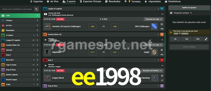 O ee1998 oferece uma grande seleção de opções de apostas em e-sports com probabilidades competitivas